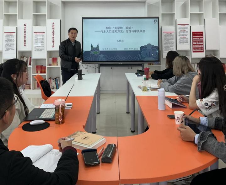 为关注非遗美学,从实践角度理解“美”,将美学理论运用于鲜活的文化现场。2025年9月26日下午,马克思主义学院非遗美学与中国美学经典问题研究团队在学生事务中心1305主办“青蓝社科学术沙龙”活动。活动邀请艺术与传媒学院巴胜超教授主讲“如何‘美学地’聆听?——传承人口述史方法、伦理与审美维度”,沙龙由娥满教授主持,美学专业全体学生参加。