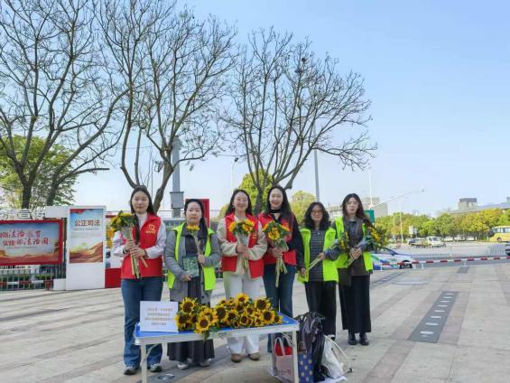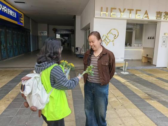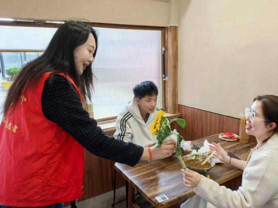 启动仪式结束后,丰富多彩的志愿服务活动全面展开。部分师生拿起扫帚、钳子、垃圾袋,迅速投入到社区商圈及主干道的环境整治行动中。他们仔细清理路面垃圾、烟头,认真擦拭公共设施,规范摆放共享单车,并对盲道上的障碍物进行细致清理。同学们分工协作、干劲十足,在劳动中体悟“劳动最光荣、奉献最美丽”的雷锋精神内涵。与此同时,“理育菁华”读书小组同学们活跃在“打卡志愿服务点送鲜花活动”的各个点位。她们热情地向居民和游客送上代表着感谢与敬意的向日葵。一束束鲜花,一句句问候,让雷锋精神在互动体验中温暖传递。
